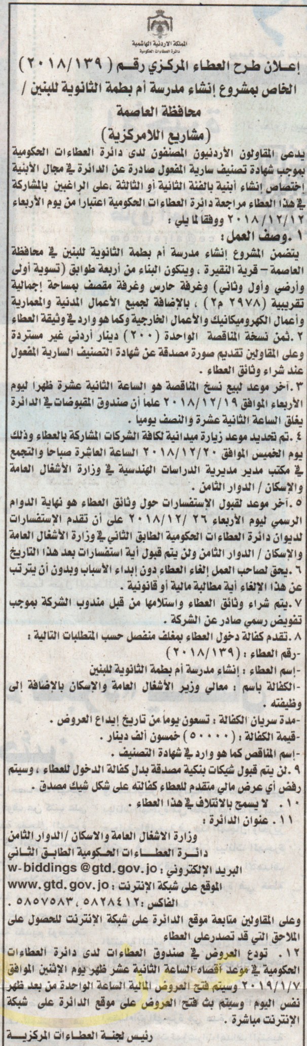 انشاء مدرسة ام بطمة الثانوية - عمان - دائرة العطاءات الحكومية