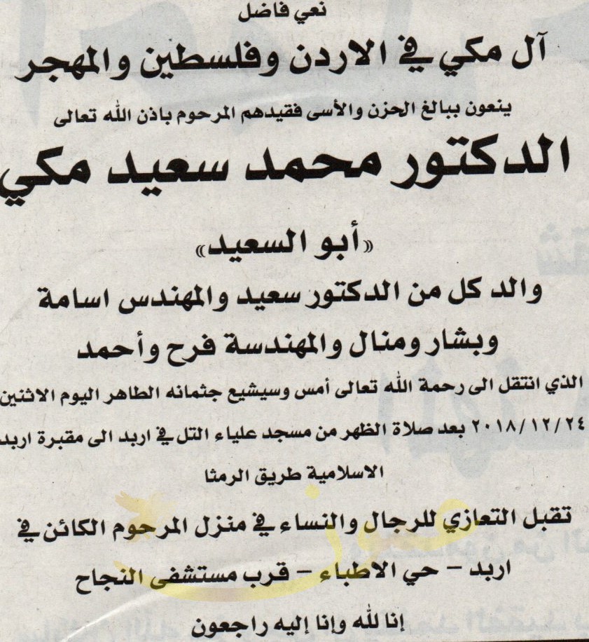 عمون- انتقل الى رحمة الله تعالى الدكتور محمد سعيد مكي "ابو السعيد"