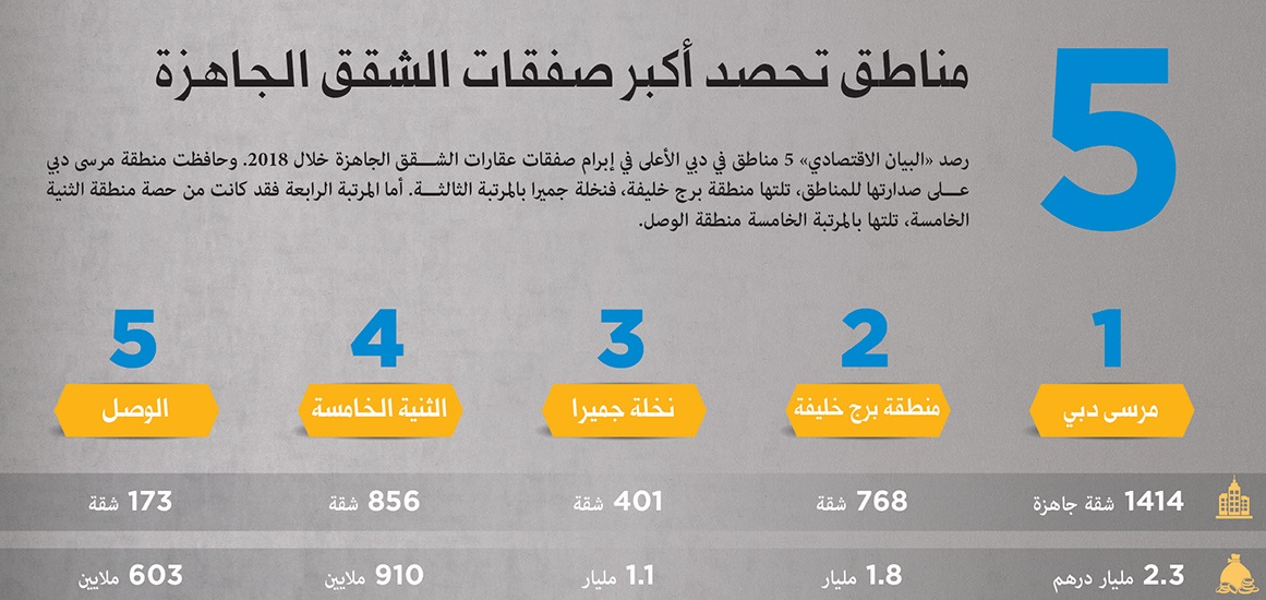 عمون - 5 مناطق في دبي الأعلى في إبرام صفقات عقارات الشقق الجاهزة خلال 2018، وحافظت منطقة مرسى دبي على صدارتها للمناطق، تلتها منطقة برج خليفة، فنخلة جميرا بالمرتبة الثالثة. أما المرتبة الرابعة فقد كانت من حصة منطقة الثنية الخامسة، تلتها بالمرتبة الخامسة منطقة الوصل.
