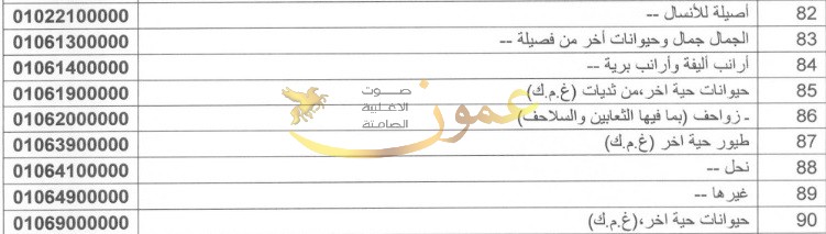 فول معلب محضرأو محفوظ بغيرالخل أوحمض الخليك أو السكر ، حمص معلب محضرأو محفوظ بغيرالخل أوحمض الخليك أو السكر ، مرتديلا,من حبش ، مرتديلا,من بط أومن أوز أومن غرغر(دجاج غينيا ، مرتديلا,من فصيلة الابقار ، مرتديلا,من لحوم أو من أحشاء وأطراف, ، أسماك غيرمفرومة,محضرةأومحفوظة ، أسماك محضرةأومحفوظةأخربمافيهاالمفرومة، معكرونة ,تحتوي على بيض,غير مطبوخة ولا محشوة ولا محضرة بطريقة أخرى ، شعيرية,لاتحتوي على بيض,غيرمطبوخةولا محشوةولا محضرة بطريقةأخرى ، طيور حية) ، نحل ، كرنب وملفوف وقرنبيط أخر وخضر مماثلة,صالحة للأكل من جنس براسيكا,طازجة أو مبردة ، خس مكبب,طازج أو مبرد ، خس أخر,طازج أو مبرد,(عدا الخس المكبب) ، هندباء (شيكوري) وتلوف ,طازجة أو مبردة ، لفت بقلي,طازج أو مبرد ، فجل صالح للاكل طازج أو مبرد ، شوندر (بنجر) للسلطةصالح للاكل طازج أو مبرد ، ماندرينه مهجنة,طازجة ، كلمنتينا مهجنة,طازجة ، جريب فروت بما فيه البوميلو,طازج, تفاح طازج للفترة من ( 1/6 الى 31/10) من (امريكا) ، - كرز حامض (برونوس سيراس ، بازلاء (بيزوم ساتيفيوم) ، لوبياء أو فاصولياء ، مقشورة (حبات) ، ملح الطّعام ، أقلام رصاص بخزان ، أقلام رصاص وأقلام تلوين برصاص محاط بغلاف صلب, أقلام تلوين ، رب البندوره (معجون البندوره) ضمن عبوات مهيأه .