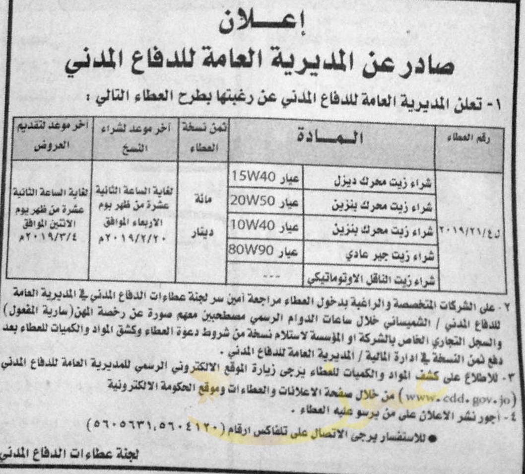 مطلوب شراء زيت محركات - مديرية الدفاع المدني
