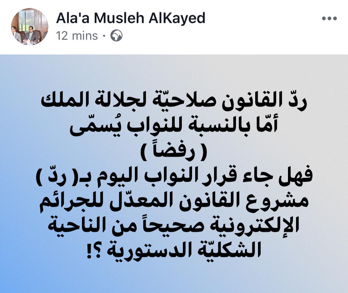 قرر مجلس النواب بالأكثريّة ( ردّ ) القانون المعدّل للجرائم الإلكترونيّة رغم أن مصطلح ( الرّد ) صلاحيّة مسندة لجلالة الملك وفقاً للمادة ( ٩٣ ) من الدستور ، بينما صلاحية المجلس النيابي وفقاً لصريح الدستور في المواد ( ٩٢،٩١ ) منه والمادة ( ٧٩ ) من النظام الداخلي للمجلس هي ( الرّفض ) ، فهل يمسّ ذلك بصحّة القرار من الناحية الدستورية الشكلية؟