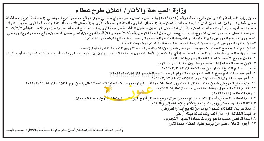 مطلوب تنفيذ اعمال سياج معدني حول معسكر اذرح الروماني - وزارة السياحة والاثار