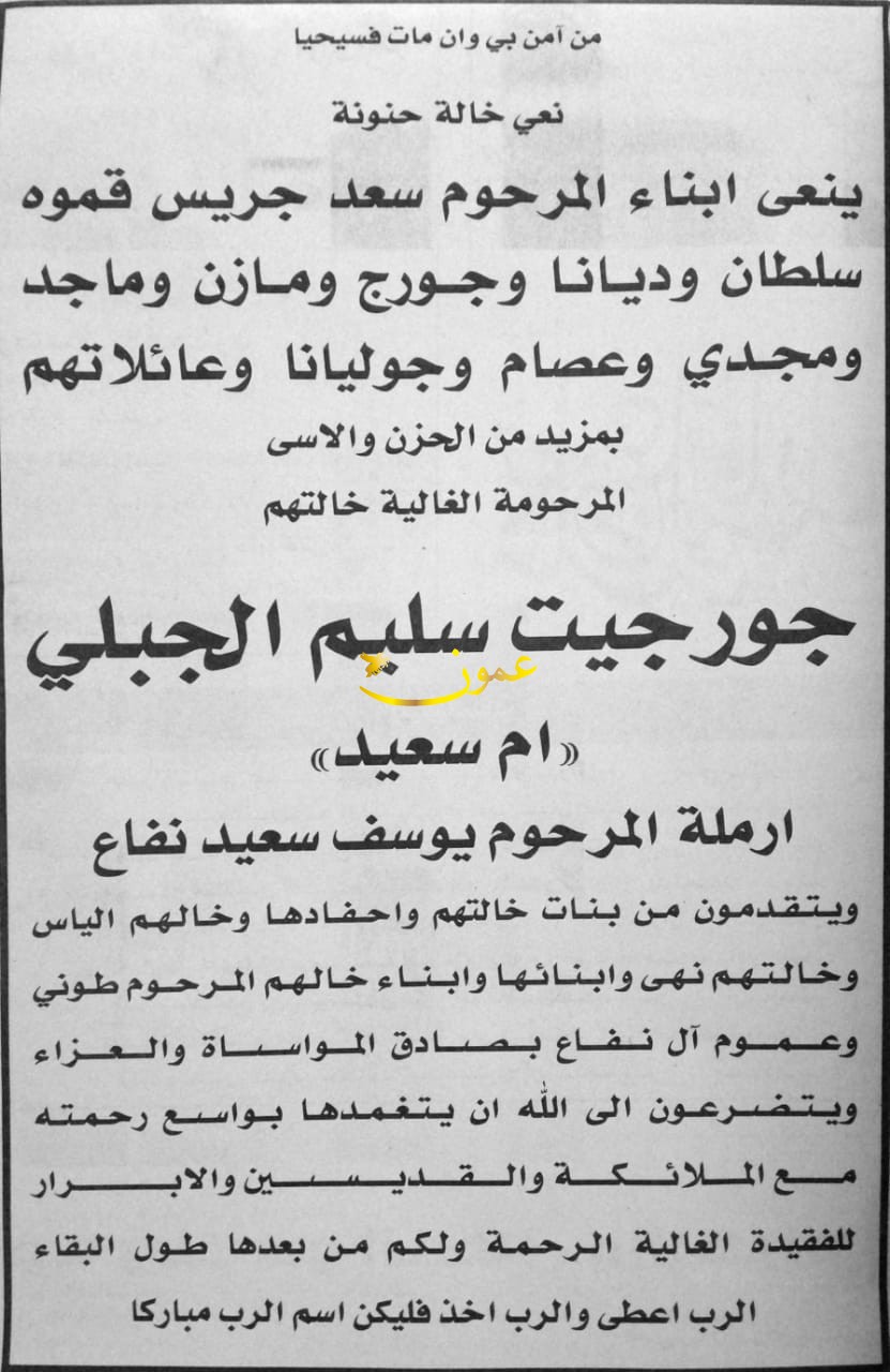عمون- انتقل الى رحمته تعالى جورجيت سليم الجبلي (ام سعيد).