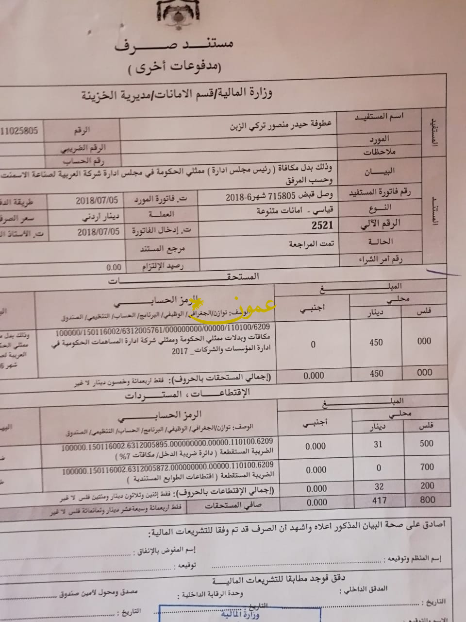 بحسب الوثائق التي حصلت عليها "عمون" فإن قيمة المكافأة عن رئاسته لمجلس ادارة ممثلي الحكومة في مجلس ادارة شركة العربية لصناعة الاسمنت، بلغت 417 دينارا أردنيا وثمانون قرشا، خلافا لما يقوله خصومه من تقاضيه آلاف الدنانير شهريا كرئيس لمجلس ادارة الفوسفات، اضافة الى وظيفته مدير عام مؤسسة المواصفات والمقاييس.