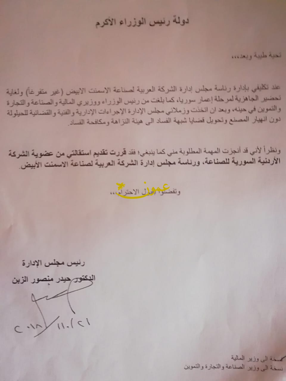 حسب كتاب استقالته - التي حصلت "عمون على نسخة منها - فإنه يستقيل بعد أن انجز المهمة، واتخذ والزملاء في مجلس الادارة الاجراءات الادارية والفنية والقضائية للحيلولة دون انهيار المصنع وتحويل قضايا شبهة الفساد الى هيئة النزاهة ومكافحة الفساد.