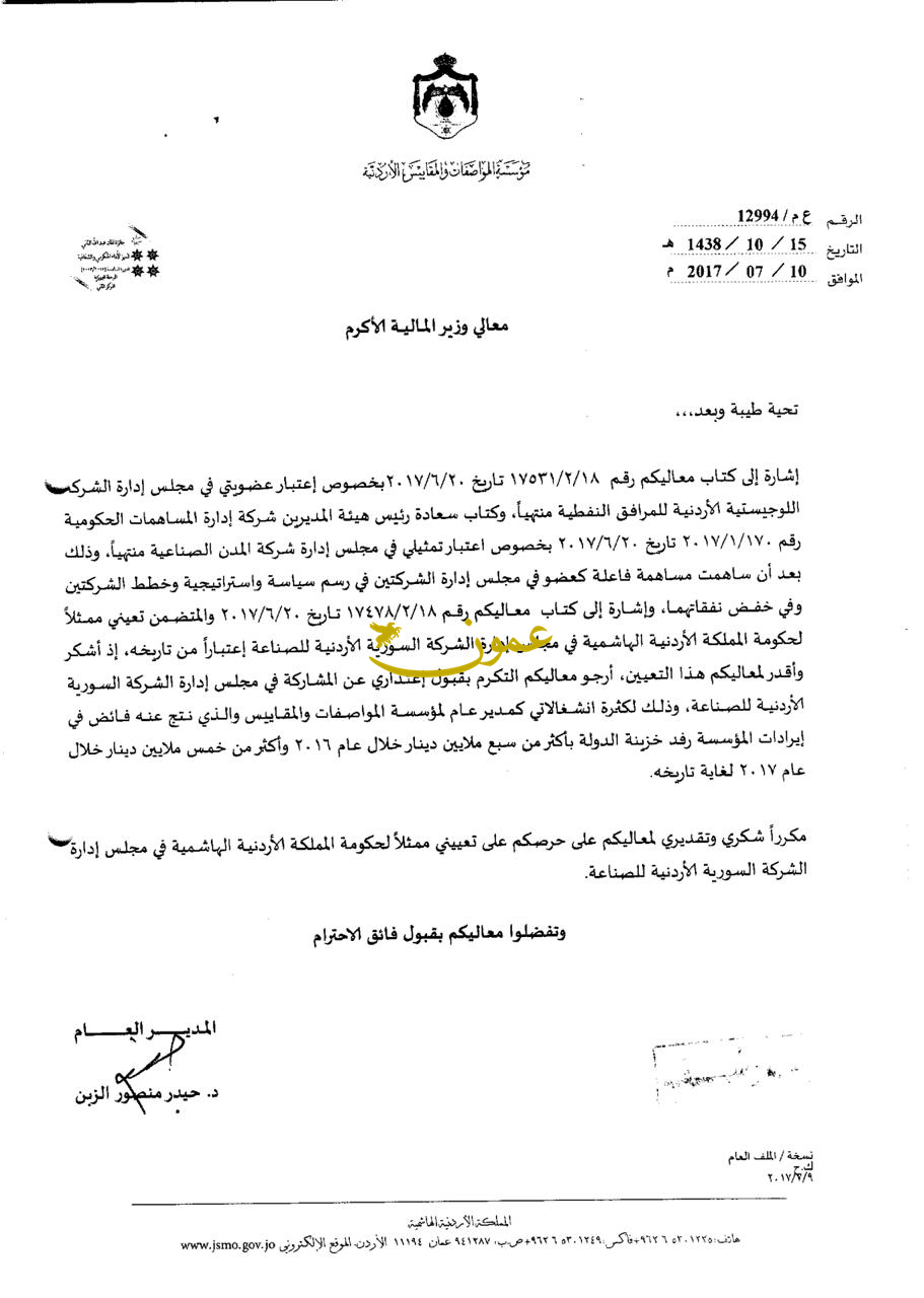 وثائق برز منها اعتذار د. الزبن، منتصف عام 2017، عن الموافقة على تعيينه ممثلا للحكومة في مجلس إدارة الشركة السورية الاردنية للصناعة.