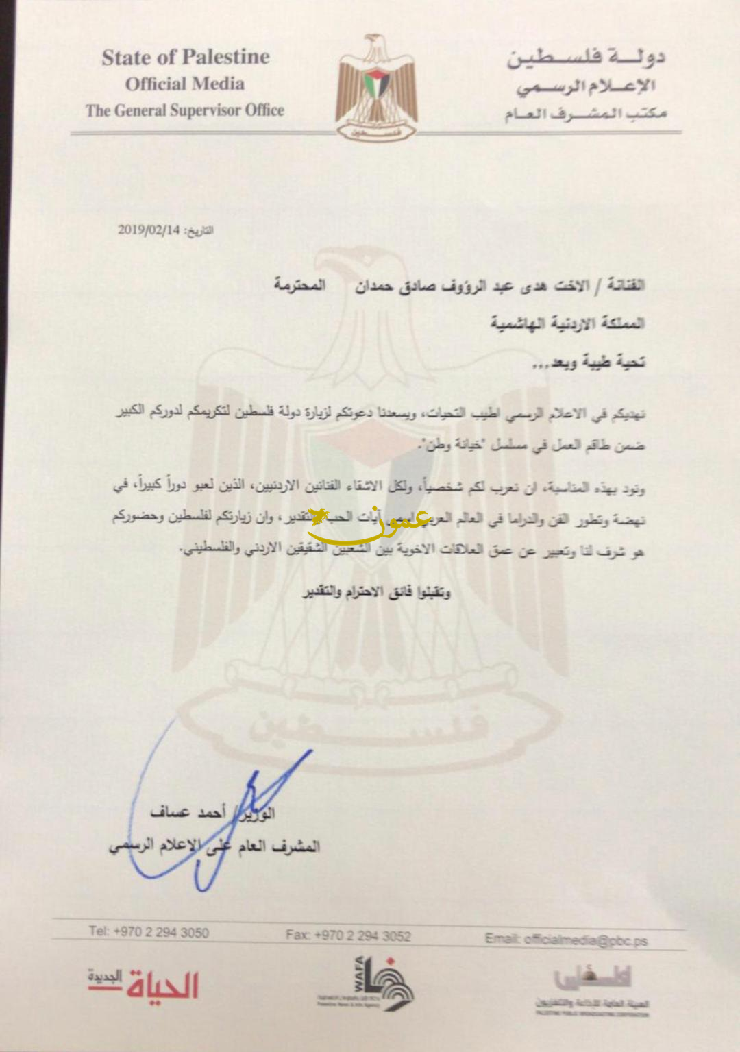 عمون - كرم رئيس دولة فلسطين محمود عباس، الفنانة الاردنية هدى حمدان وأسرة مسلسل "خيانة وطن "، تقديراً لأعمالهم الفنية الهادفة التي اسهمت في رفع مستوى الوعي الثقافي والوطني لدى ابناء أمتنا العربية حيث استقبل سيادته، في مقر الرئاسة بمدينة رام الله، اسرة مسلسل "خيانة وطن".
