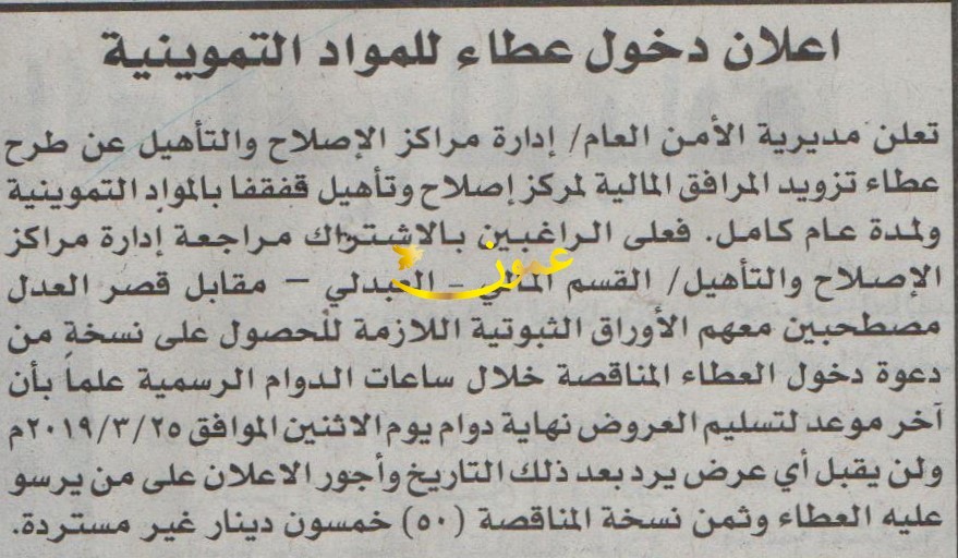 مطلوب توريد مواد غذائية - ادارة مراكز الاصلاح والتأهيل - مديرية الامن العام
