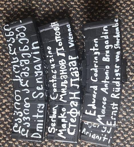 كما تداولت حسابات على "تويتر" صوراً لأسلحة استخدمها مطلق النار على المسجد تُظهر صندوق سيارة مطلق النار وبه أسلحة أوتوماتيكية، نقش عليها أسماء بطريقة مبعثرة، بما في ذلك أسماء اثنين من القتلة الذين استهدفوا المهاجرين والمسلمين.