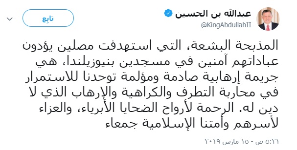 الملك: المذبحة البشعة في مسجدين بنيوزيلندا جريمة إرهابية صادمة ومؤلمة15-03-2019 02:27 PM