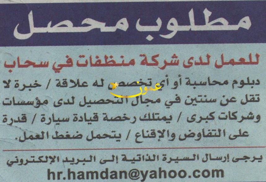 مطلوب محصل للعمل لدى شركة منظفات في سحاب