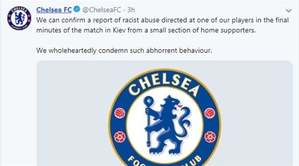 وقال تشيلسي في بيان بموقعه على الإنترنت: "يمكننا تأكيد تقارير عن إساءة عنصرية وجهت إلى أحد لاعبينا في الدقائق الأخيرة من المباراة في كييف من قطاع صغير من جماهير الفريق صاحب الأرض".
