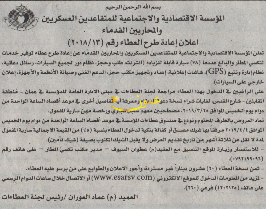 مطلوب توفير خدمات لتكسي المطار -مؤسسة المتقاعدين العسكريين