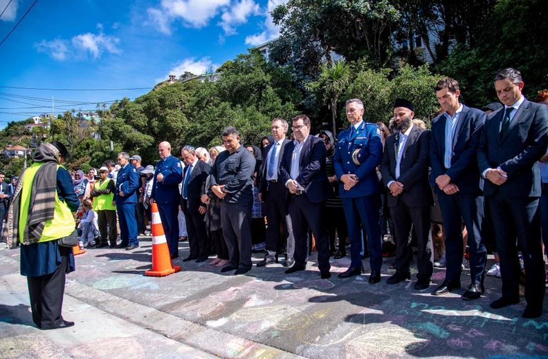ومع إذاعة الآذان في ارجاء البلاد، وقف الآلاف من بينهم رئيسة الوزراء جاسيندا أرديرن والناجون المصابون، في حديقة قبالة المسجد الذي بدأت فيه المذبحة المروعة.