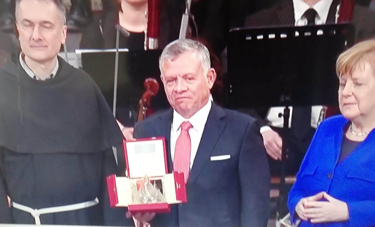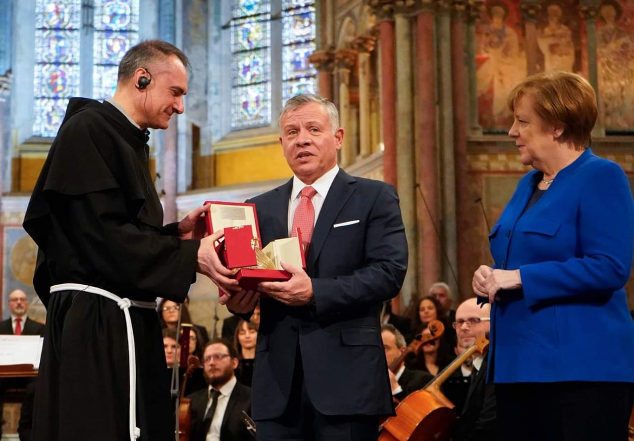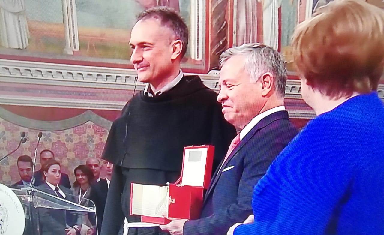 وسلم الأب ماورو غامبيتّي حارس دير أسيزي جلالة الملك الجائزة، التي تمنح لشخصيات عالمية تقديراً لجهودهم في تعزيز السلام والعيش المشترك، خلال فعالية نظمتها الرهبنة الفرنسيسكانية الكاثوليكية في كاتدرائية فرنسيس الأسيزي الواقعة في مدينة أسيزي الإيطالية، تقديراً لدور جلالة الملك في حفظ الأمن والاستقرار في المنطقة والعالم وتوظيف حوار الأديان والوئام كأداة إيجابية في ساحة العمل الدولي والدبلوماسي.