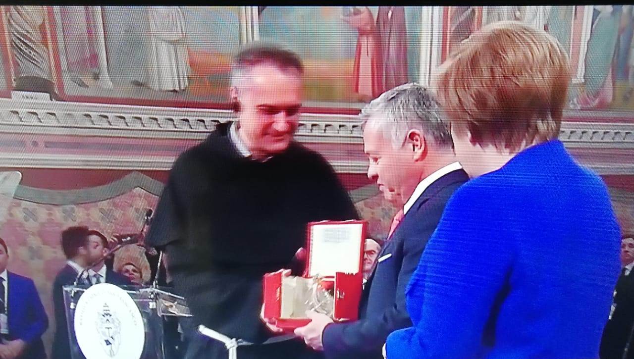 كما تضمنت الفعالية كلمة للمستشارة الألمانية ميركل التي فازت بالجائزة العام الماضي، إضافة الى كلمة للأب غامبيتّي.