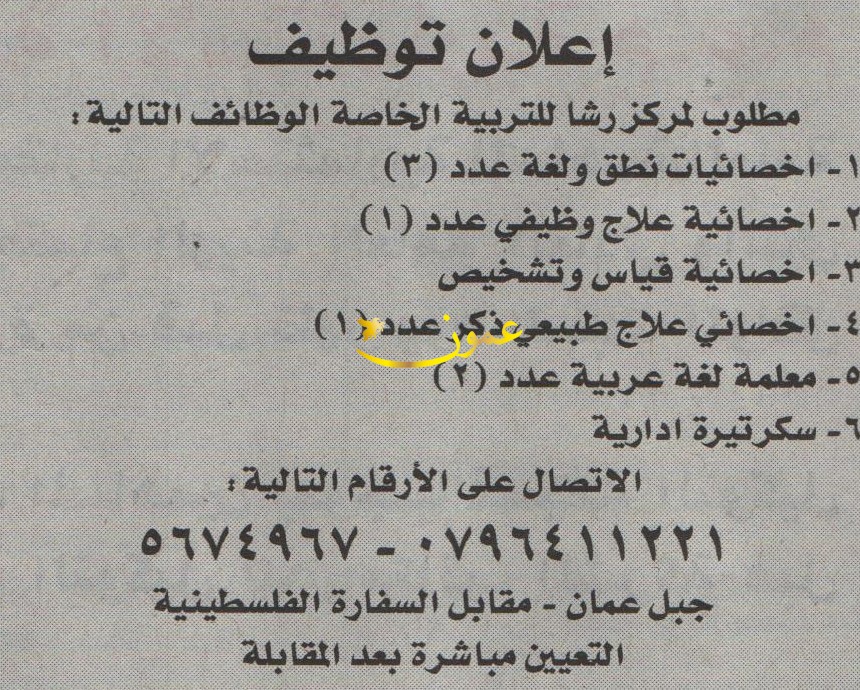 مركز رشا للتربية الخاصة يتوفر لديه وظائف شاغرة