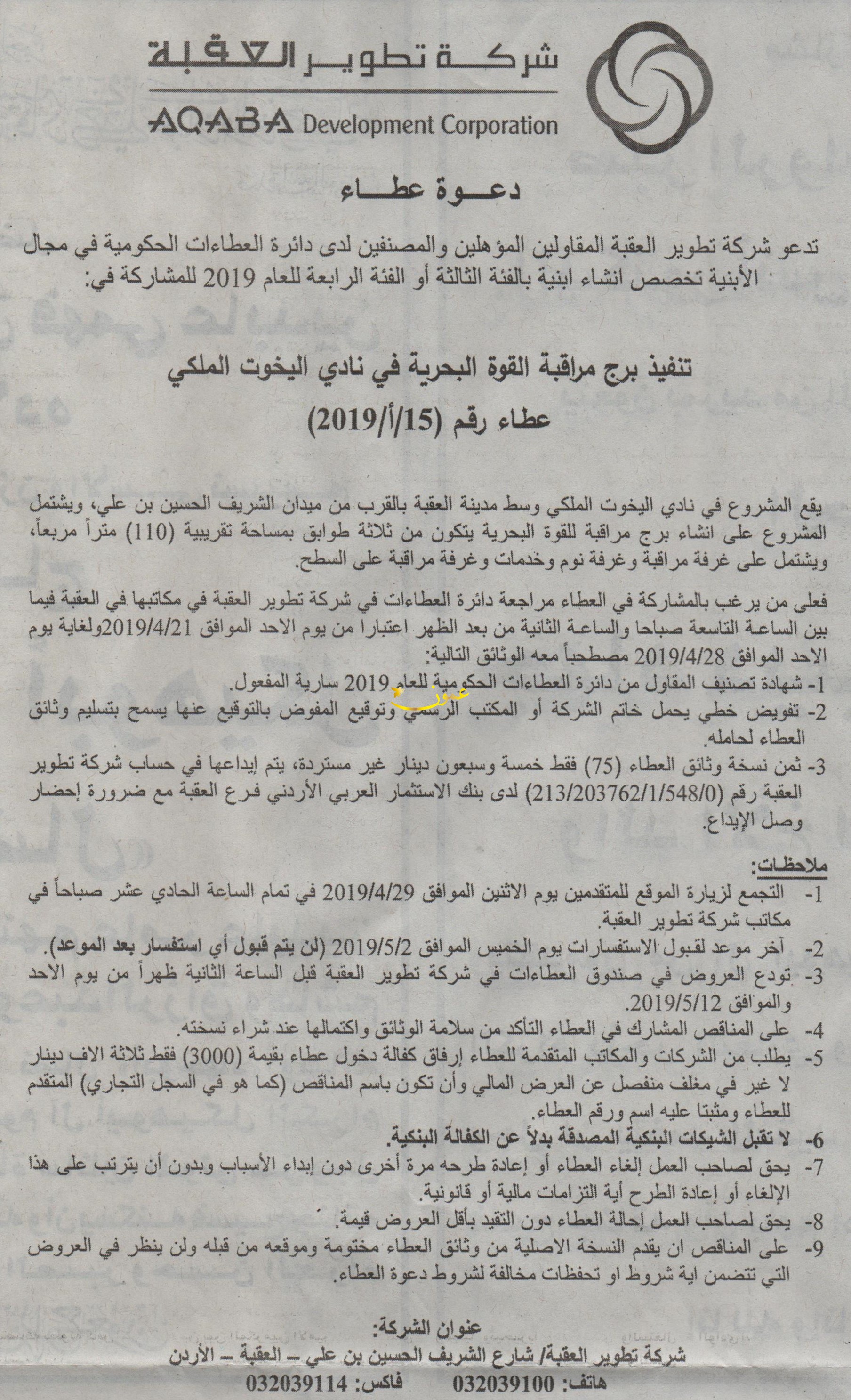 مطلوب تنفيذ برج لمراقبة القوة البحرية- نادي اليخوت الملكي -شركة تطوير العقبة