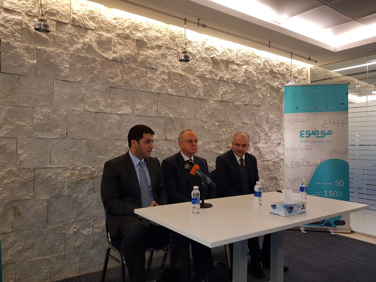 عمون- أعلن وزير العمل سمير سعيد مراد, والإتصالات وتكنولوجيا المعلومات المهندس مثنى الغرايبة خلال مؤتمر صحفي اليوم الأحد في مبنى شركة "موضوع.كوم" بحضور رامي القواسمي أحد مؤسسي الشركة والمدير التنفيدي عن توفير حوالي 150 وظيفة جديدة ستتيح الفرصة لنخبة من الشباب الأردني للإندماج بأقسام الشركة والمشاركة بمسيرتها التي تهدف لأن تكون الأولى عربيا بحجم المحتوى وعدد المستخدمين، و لتكون الأولى عالميا بمستوى التقنيات الذكية التي يجري تطويرها حاليا, وسيتم الإعلان عنها قريبا ضمن خطة الشركة للتوسع بقطاع الإنترنت إقليميا بهدف إطلاق مجموعة جديدة من التطبيقات الرقمية الذكية للمستخدم العربي.