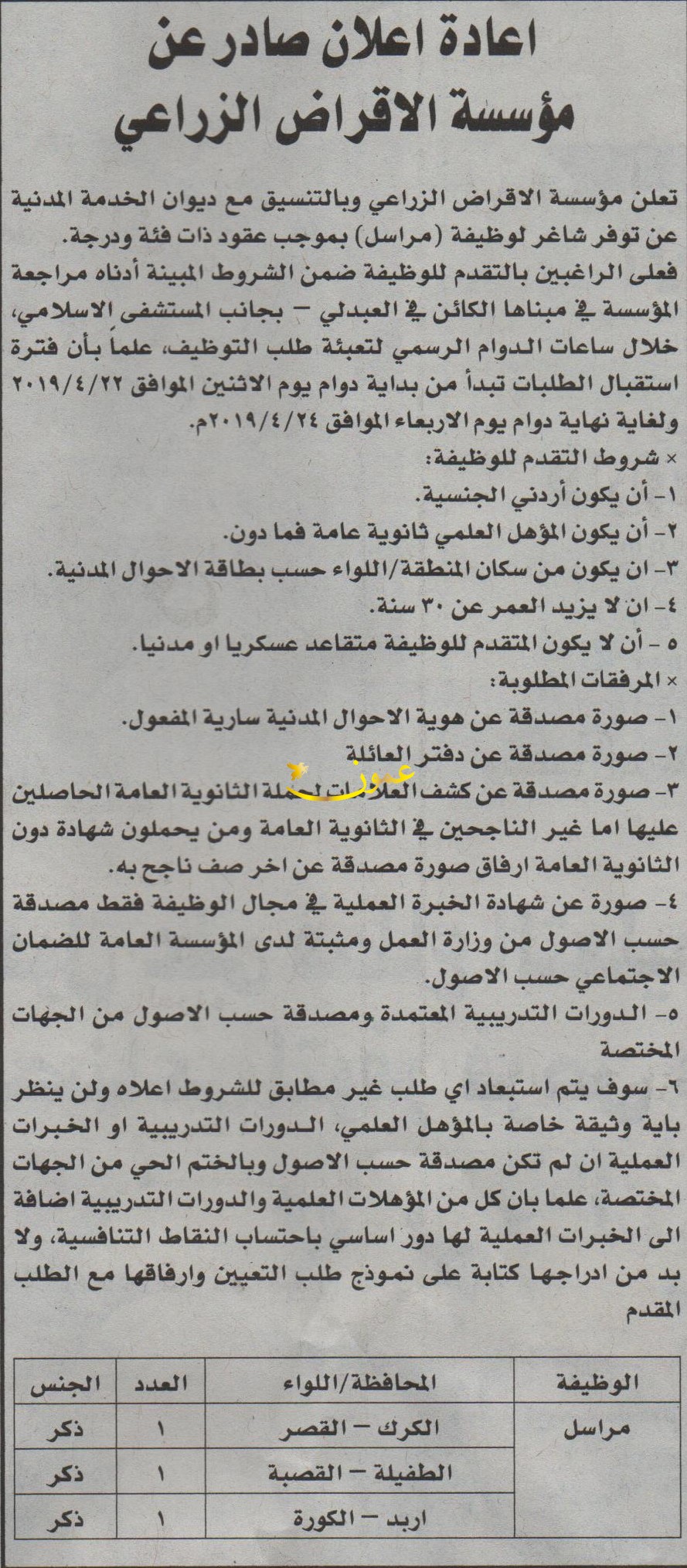تعلن مؤسسة الاقراض الزراعي بالتنسيق مع ديوان الخدمة المدنية عن توفر شاغر لوظيفة