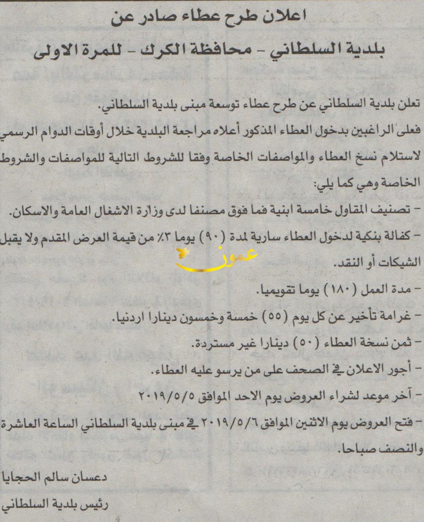مطلوب تنفيذ توسعة لمبنى بلدية السلطاني - الكرك