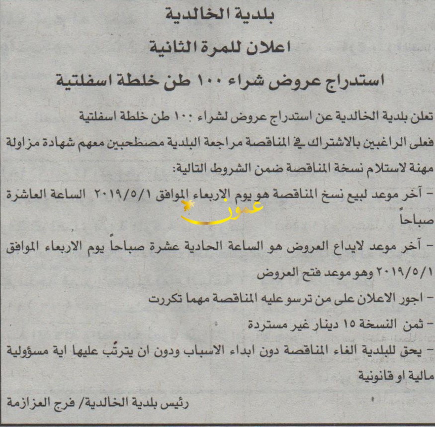 مطلوب استدارج عروض شراء "100"طن خلطة اسفلتية - بلدية الخالدية