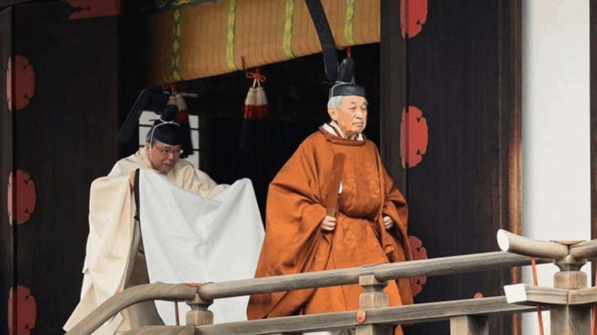 وأعلن أكيهيتو تنازله عن العرش في مراسم أقيمت في مكان مقدس داخل ساحات القصر الإمبراطوري، أقيم لتمجيد إلهة الشمس أماتيراسو أوميكامي، التي تقول الأسطورة إن السلالة الإمبراطورية تنحدر منها.