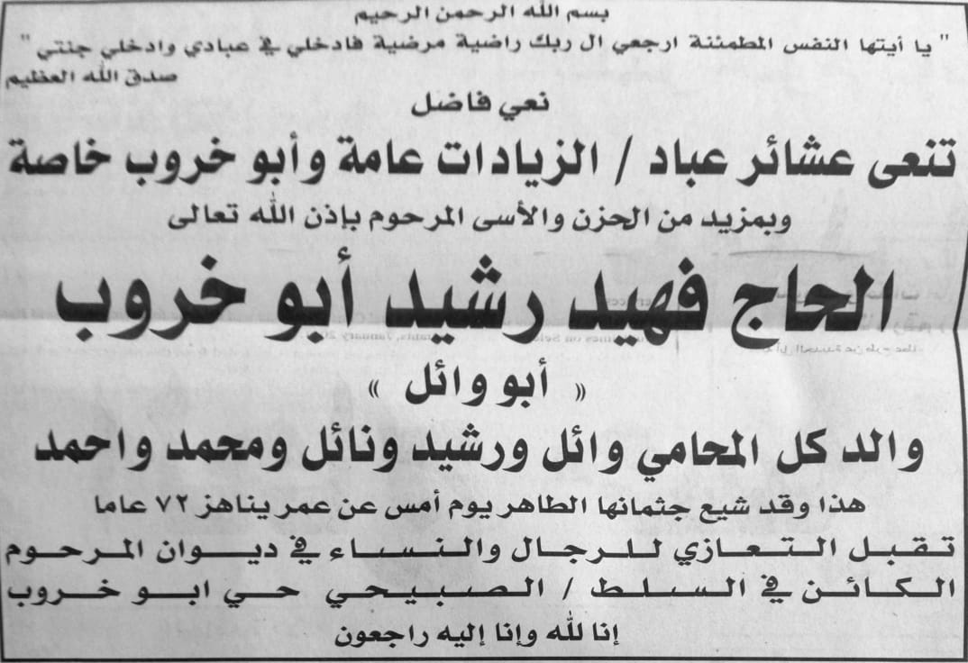 الحاج فهيد رشيد ابو خروب في ذمة الله