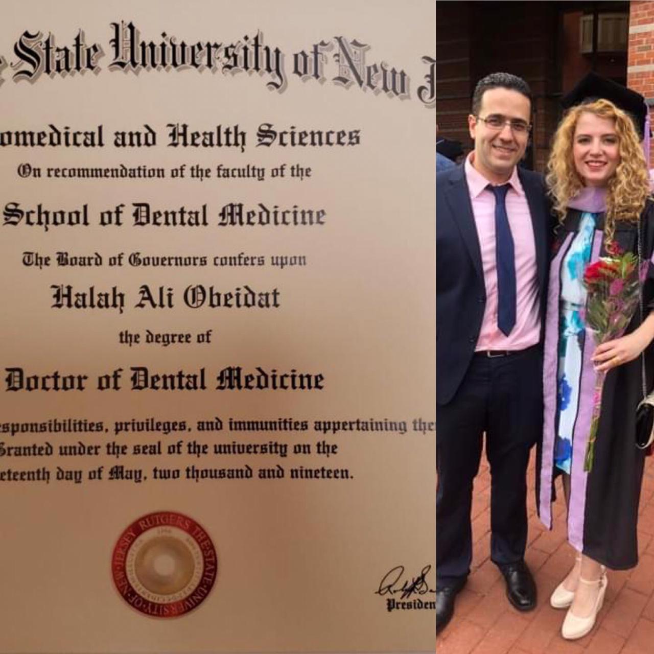عمون- الوالد اللواء الطبيب المتقاعد علي عبيدات و الوالدة فلورنتينا عبيدات و كل من الأخوان الدكتور سامر و الدكتورة سارة و الدكتورة لانا يهنؤون ابنتهم الغالية الدكتورة هاله عبيدات زوجة الدكتور محمد شخاترة بمناسبة تخرجها من جامعة رتجرز لطب الاسنان نيو جيرسي بمرتبة الشرف. |