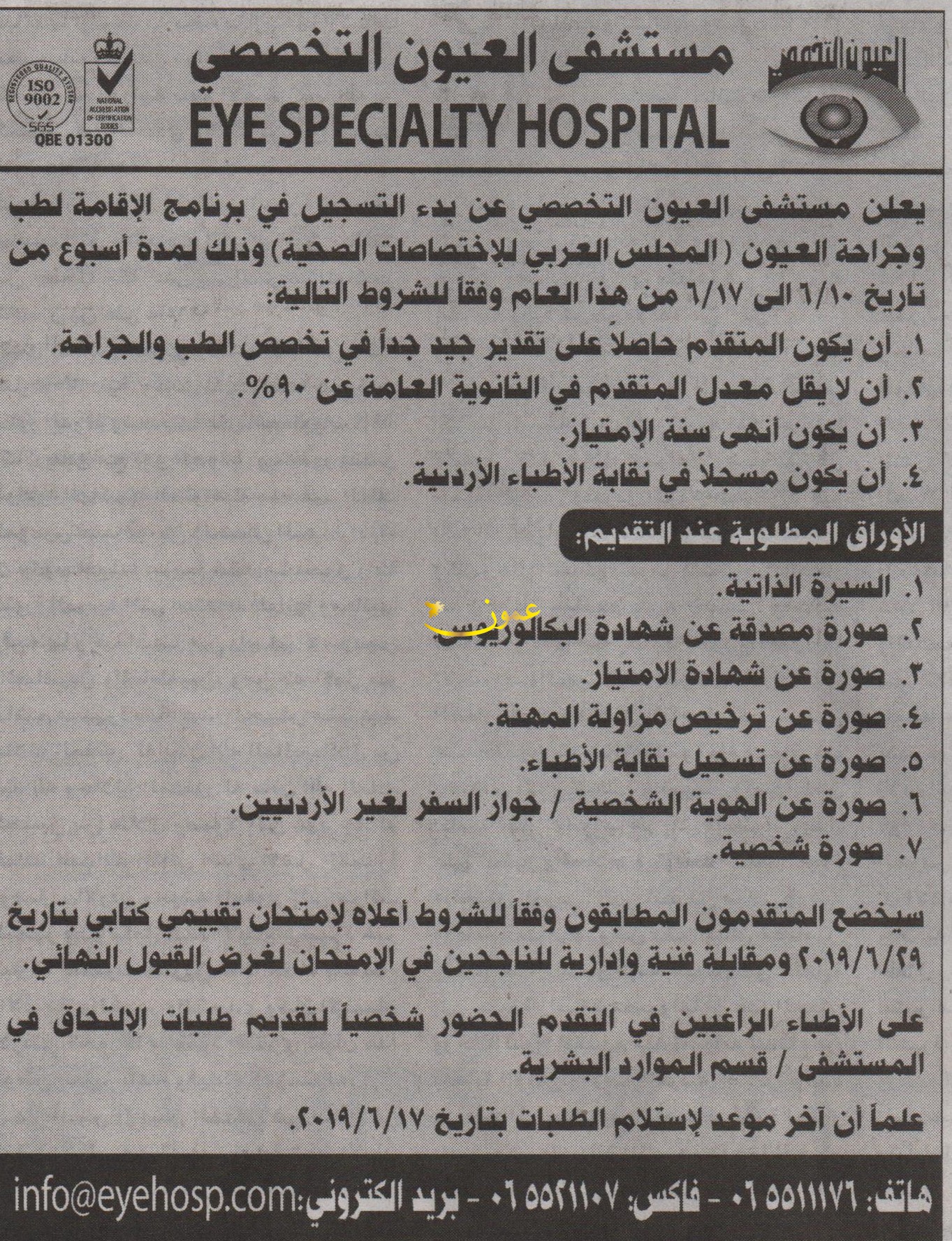 وظاف شاغرة لدى مستشفى العيون التخصصي
