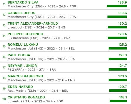 في حين، احتل النجم البرتغالي كريستيانو رونالدو، هداف يوفنتوس، المركز العشرين، وتقدر قيمته السويقية بـ (118.1) مليون يورو.