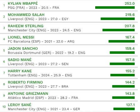 وتصدر مهاجم باريس سان جيرمان ومنتخب فرنسا، كليان مبابي، القائمة، وقدرت قيمته السوقية بـ (252.2) مليون يورو.