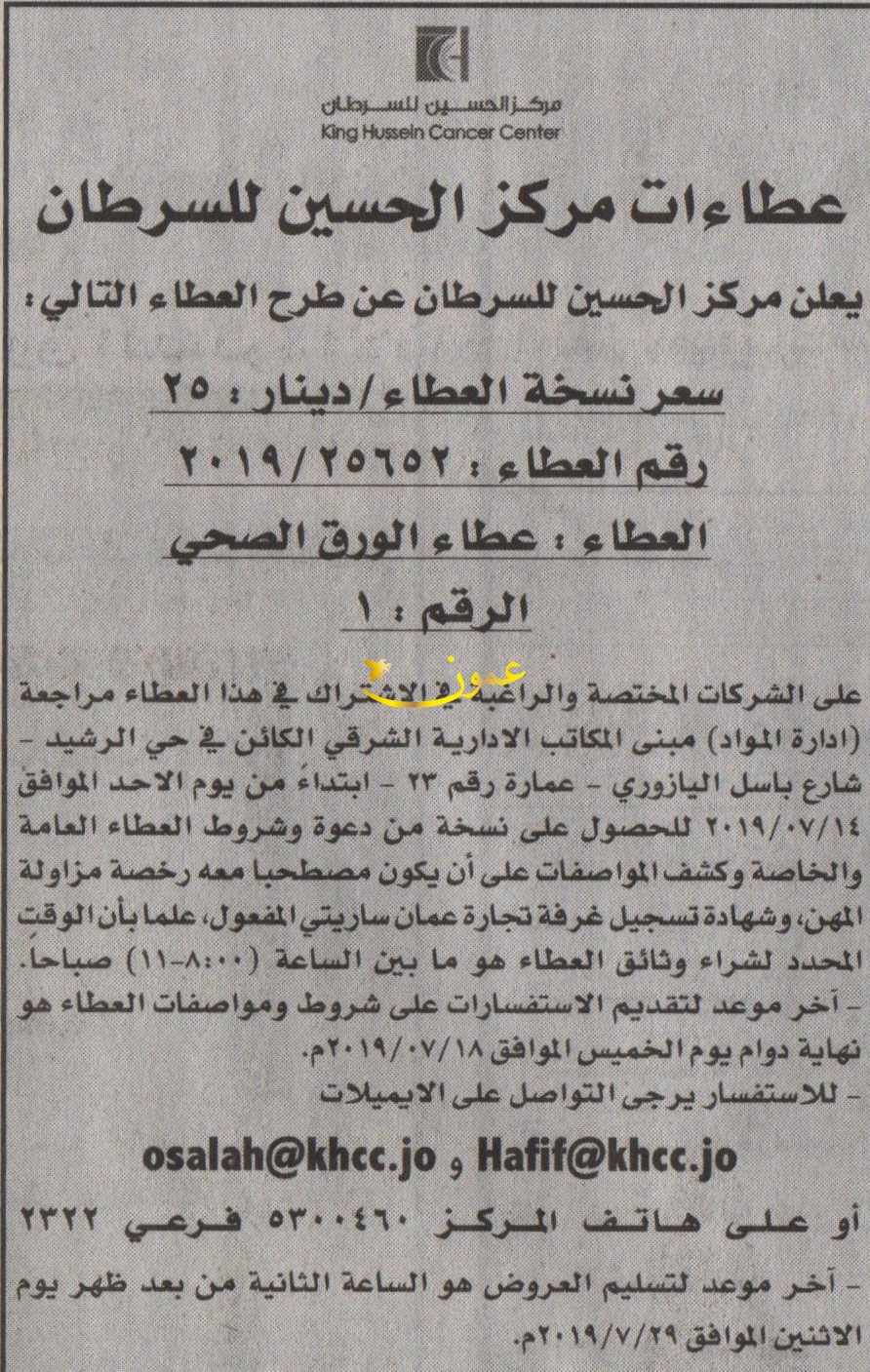مطلوب شراء ورق صحي - مركز الحسين للسرطان