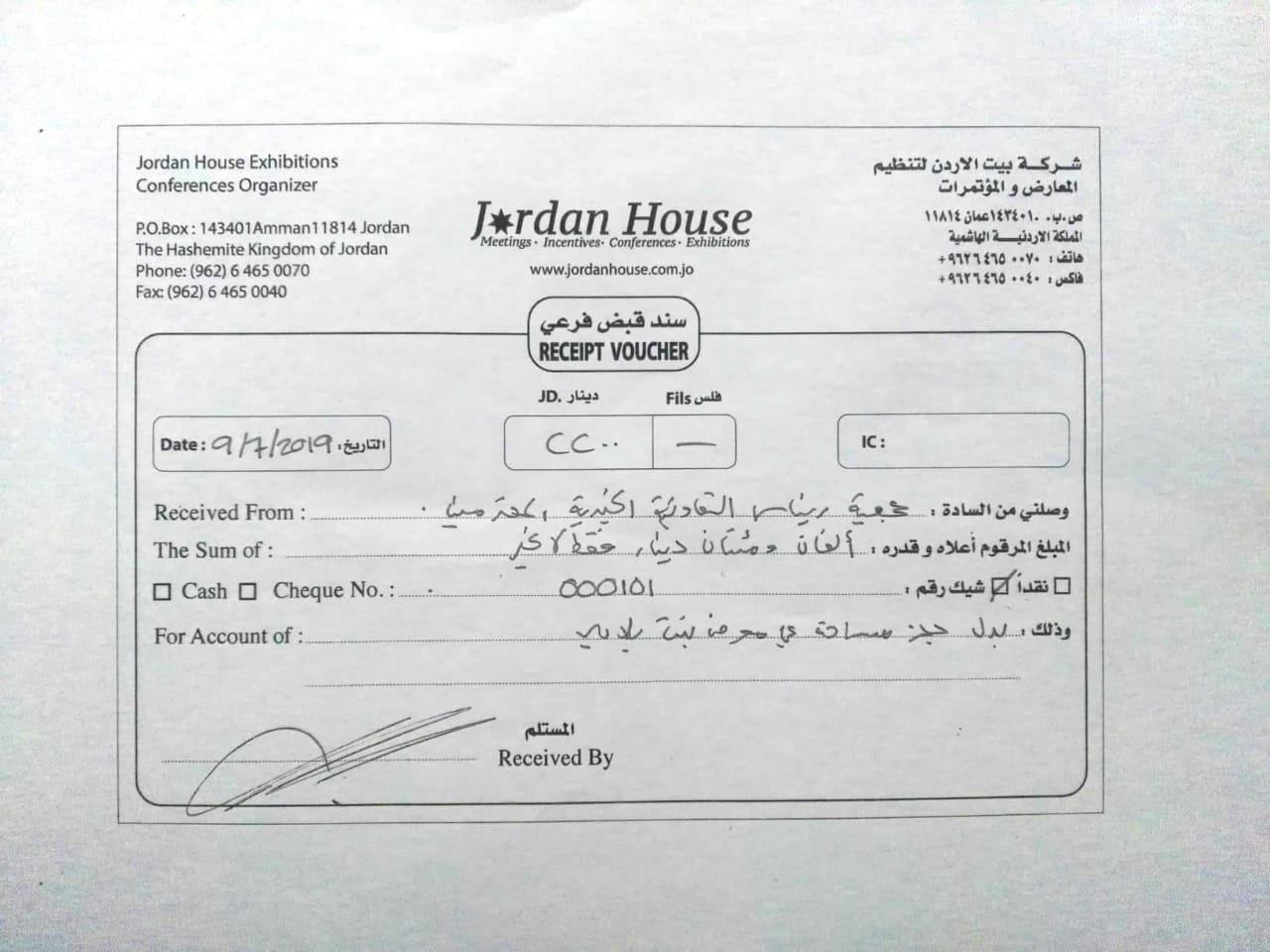 2. ادعت اللجنة المنظمة أنها لم تتلقى أي دعم من أي جهة كانت، وهذا عار عن الصحة تماما، حيث وصلني سند قبض بمبلغ 2200 دينار تم قبضه من إحدى الجمعيات الخيرية لصالح معرض بنت بلادي!!!، فإذا كان المعرض خيري ومجاني كما تدعي، فكيف لها أن تقبض هذا المبلغ ومن جمعية خيرية؟؟؟!!! ( المستند موجود لدى موقع عمون ولم يتم نشره حفظا للحقوق).