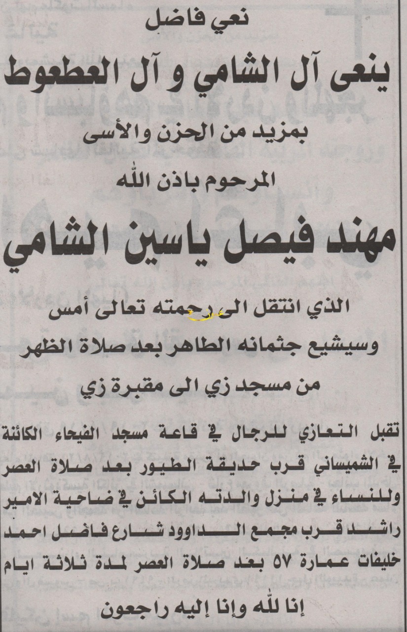 عمون- انتقل الى رحمة الله تعالى مهند فيصل ياسين الشامي.