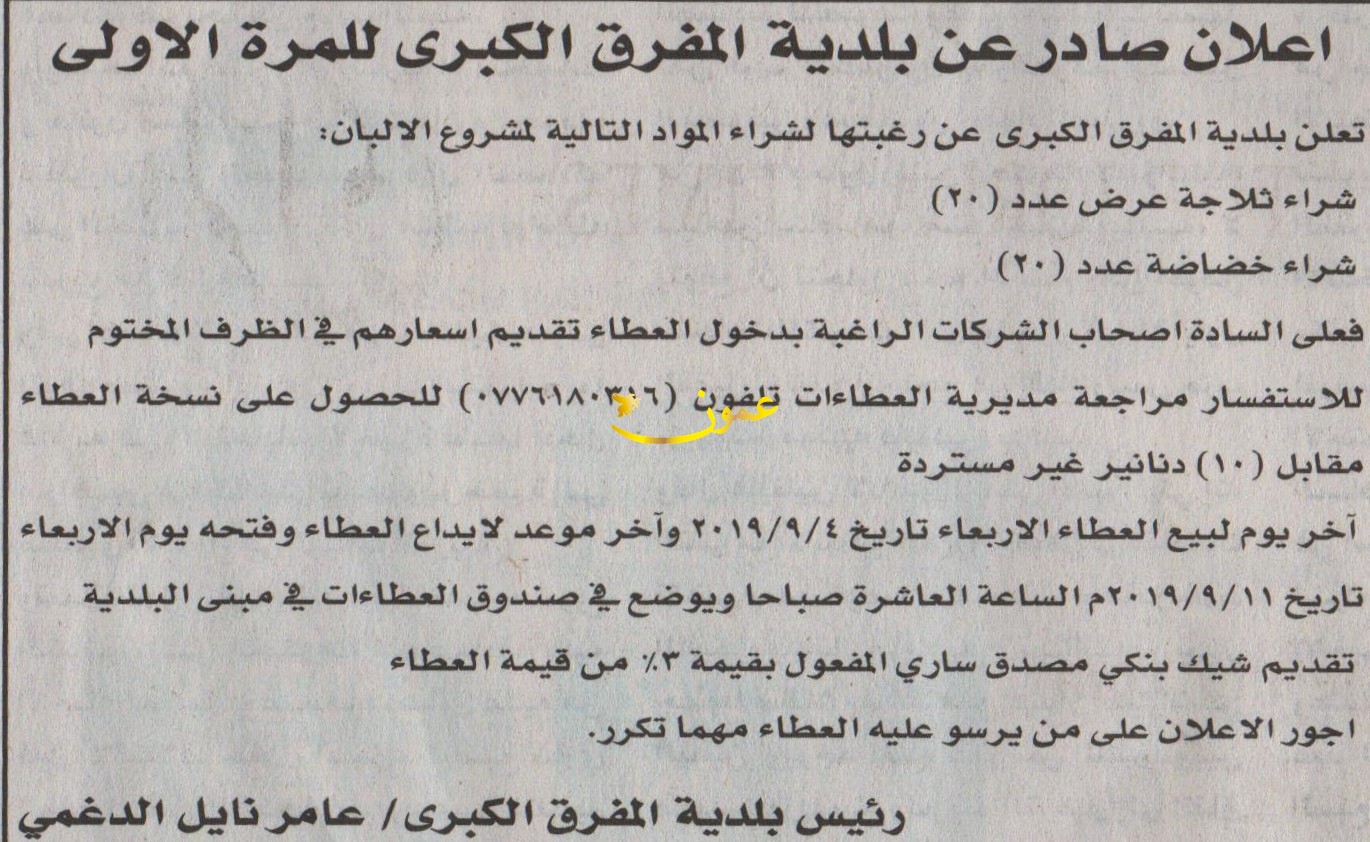 مطلوب شراء ثلاجة عرض عدد"20"- بلدية المفرق