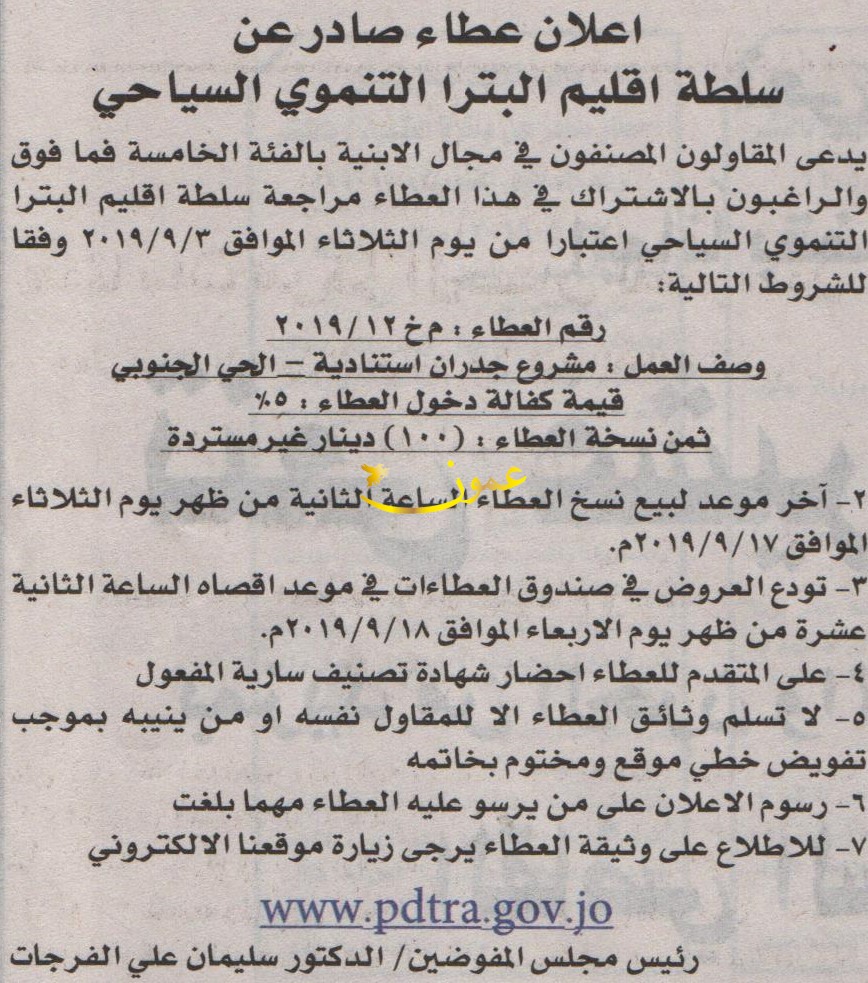مطلوب تنفيذ جدران استنادية - سلطة اقليم البترا