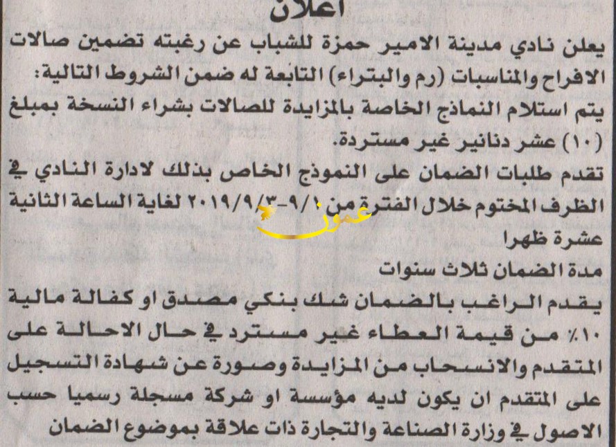 مطلوب تضمين صالات افراح -نادي مدينة الامير حمزة للشباب