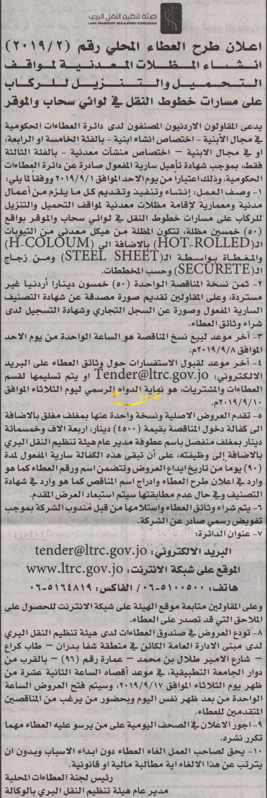 مطلوب انشاء مظلات معدنية لمواقف تحميل وتنزيل الركاب -هيئة تنظيم النقل البري