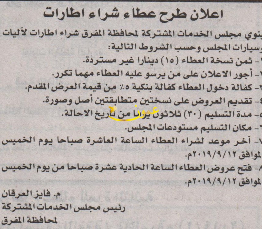 مطلوب شراء اطارات الاليات - مجلس الخدمات المشتركة للمفرق