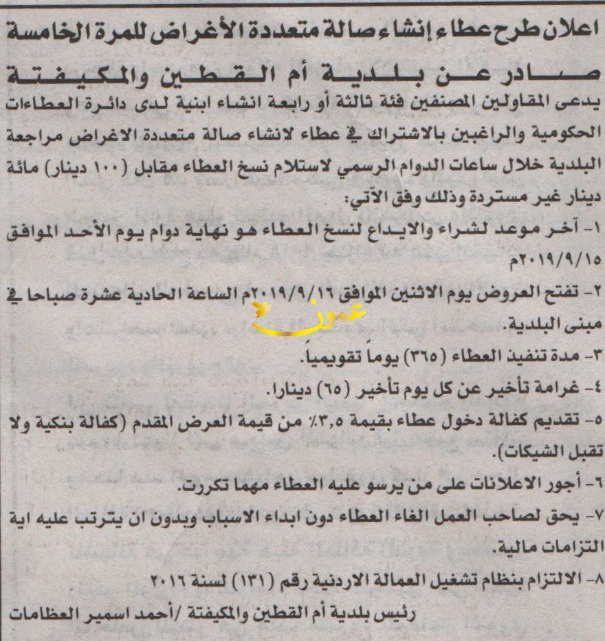 مطلوب انشاء صالة متعددة الاغراض - بلدية ام القطين والمكيفتة