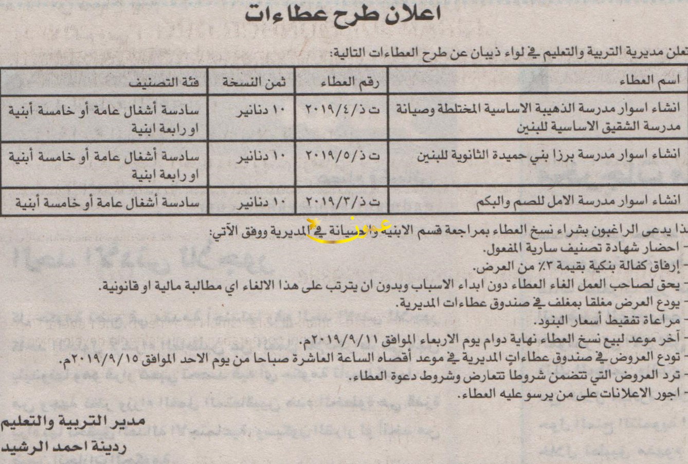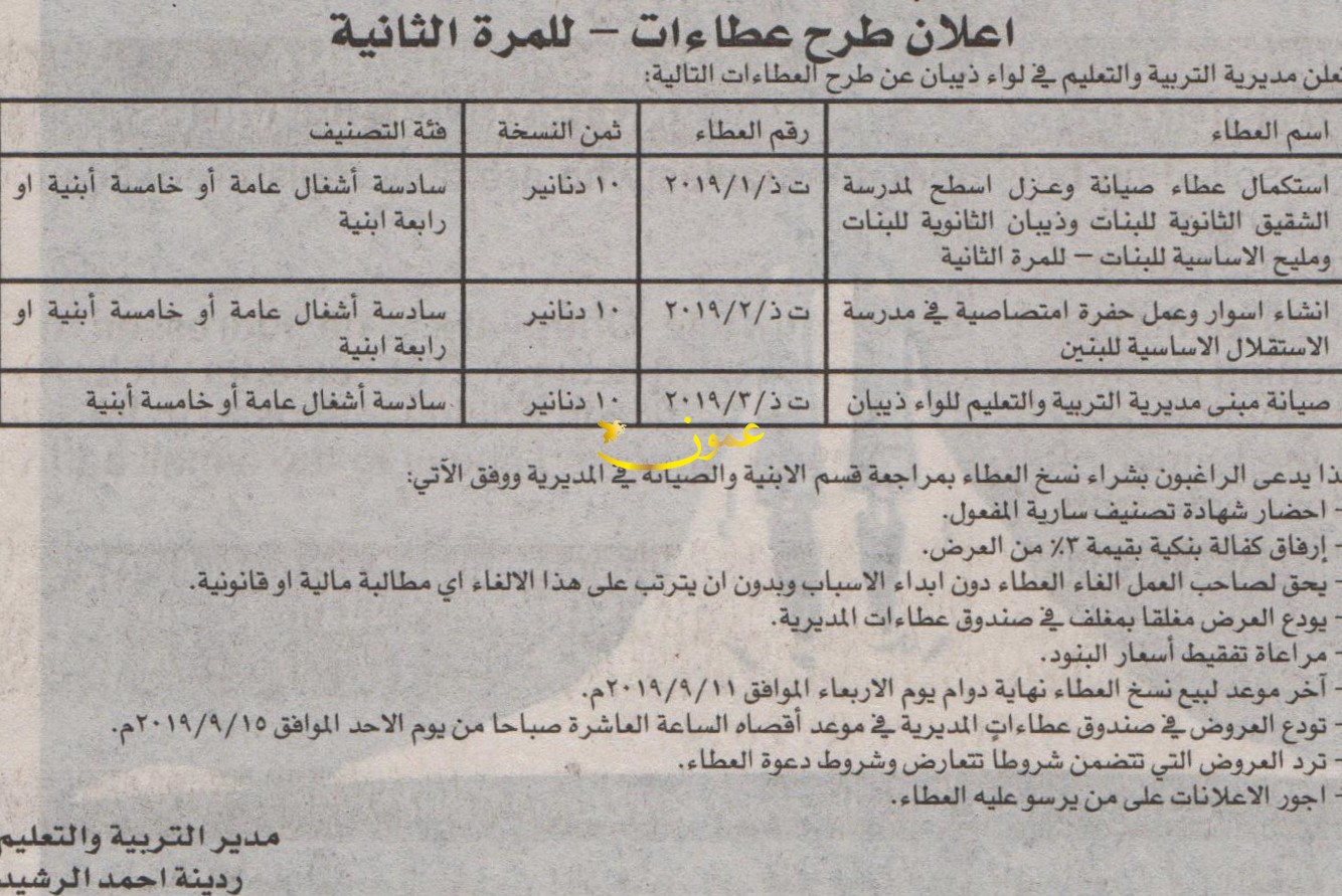مطلوب صيانة مدارس - مديرية تربية وتعليم ذيبان