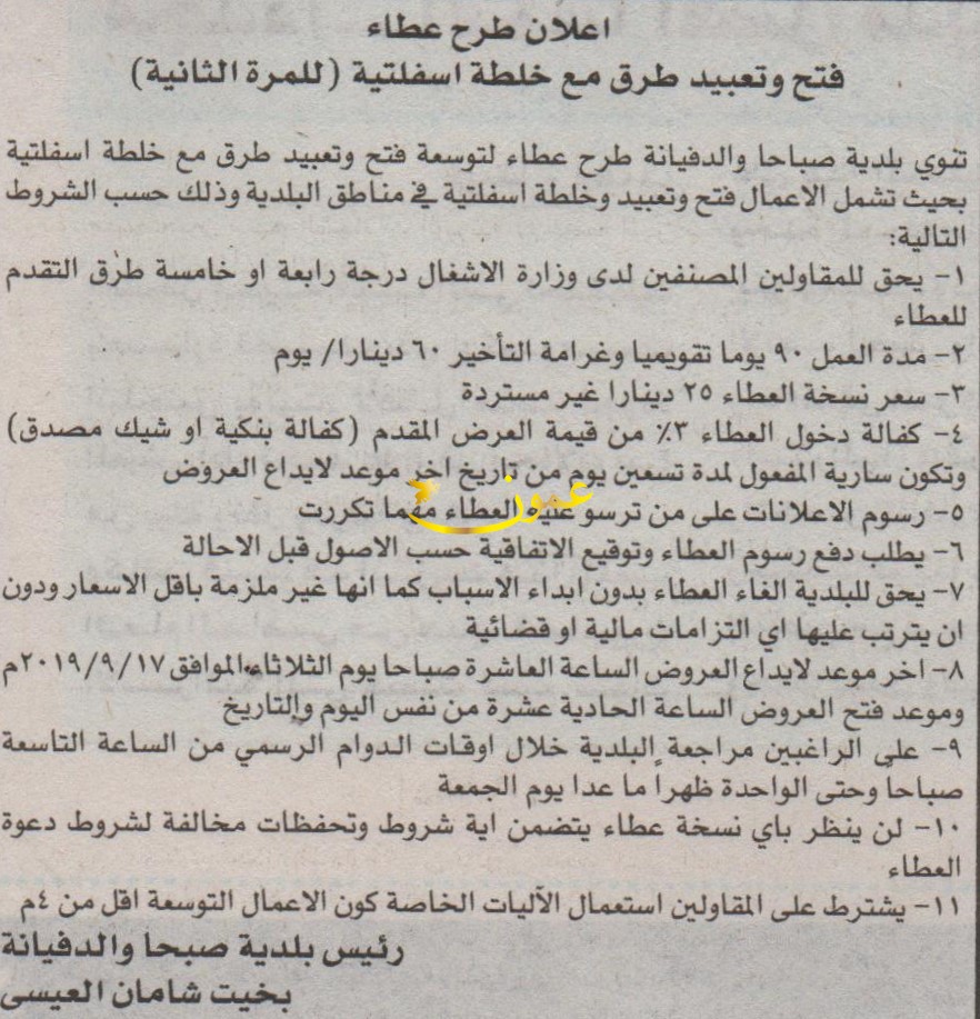 مطلوب توريد خلطة اسفلتية ساخنة - بلدية صبحا والدفيانة