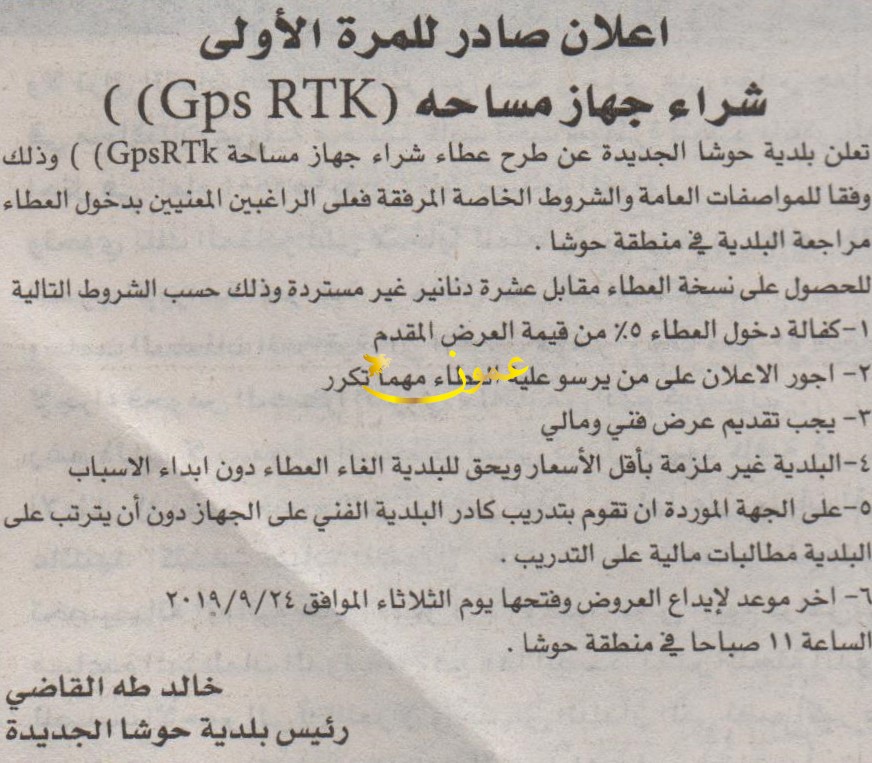 مطلوب شراء جهاز مساحة "GPS" -بلدية حوشا