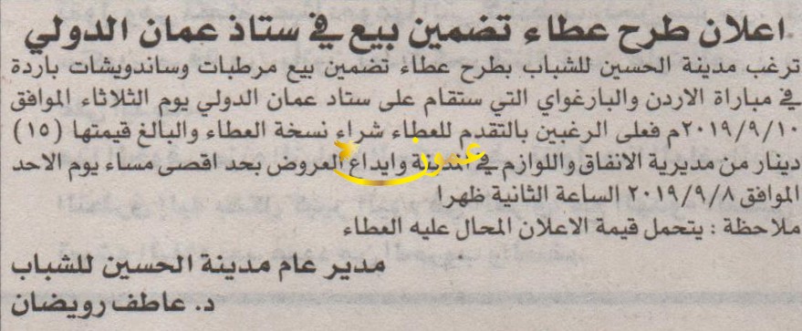 مطلوب تضمين بيع مرطبات وساندويشات في ستاذ عمان الدولي