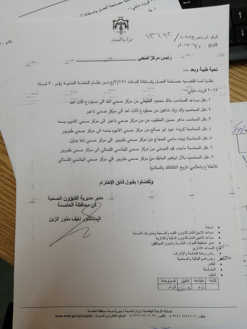 عمون - ينال المعاني - قرر مدير مديرية الشؤون الصحية في محافظة العاصمة الدكتور نايف الزبن اجراء تشكيلات داخلية في المراكز الصحية التابعة للمديرية .