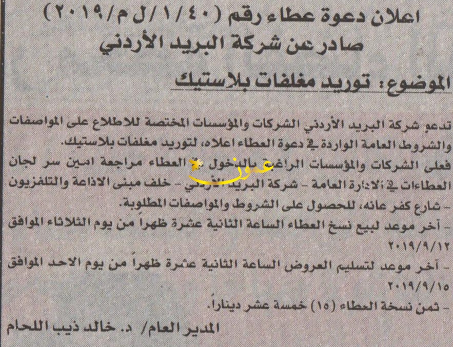 مطلوب توريد مغلفات بلاستيك - شركة البريد الاردني