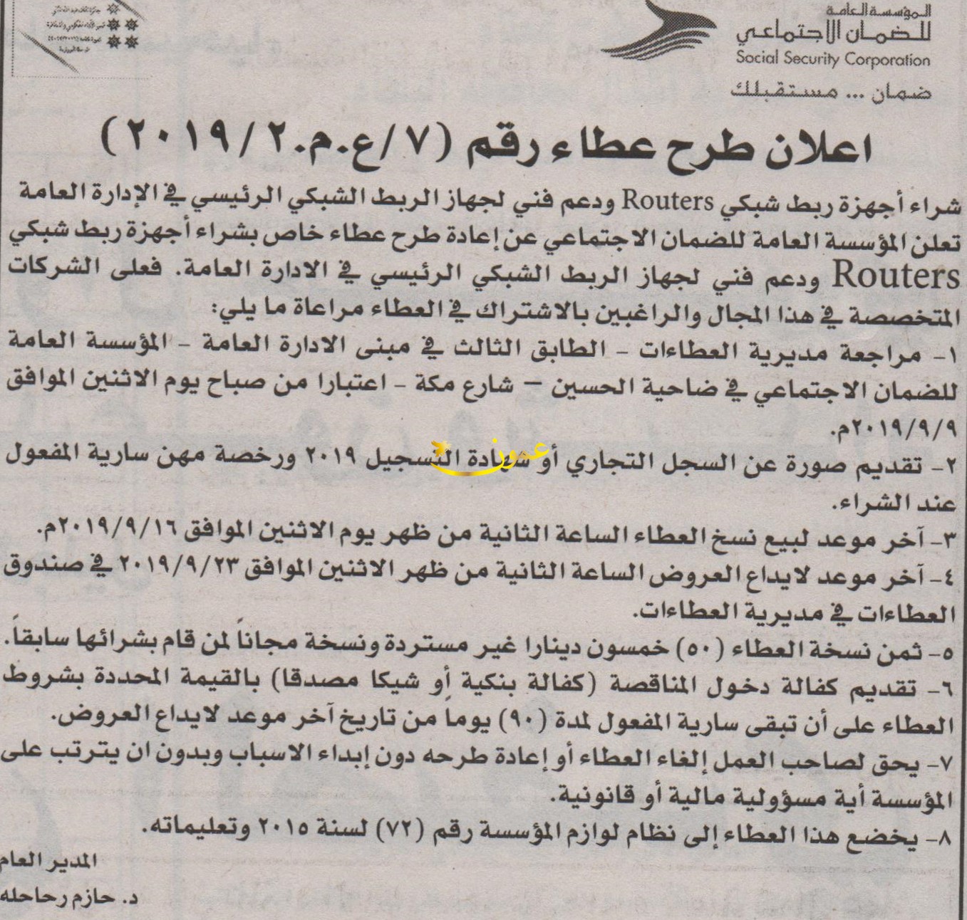 عطاءات صادرة عن مؤسسة الضمان الاجتماعي