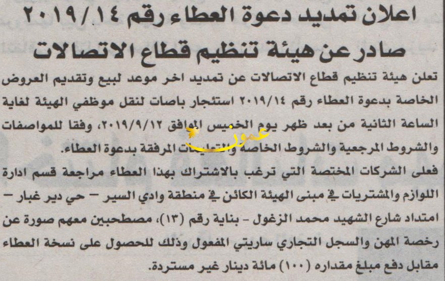 مطلوب اسئجار باصات لنقل موظفي هيئة تنظيم قطاع لاتصالات